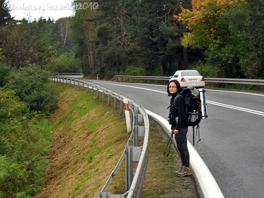 marszu w smrodzie spalin, wzdłuż ruchliwej drogi przez Skawę i