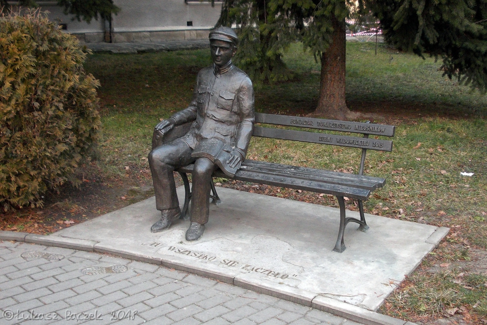 upamiętnienia tego faktu na froncie budynku ustawiona jest ławeczka, na