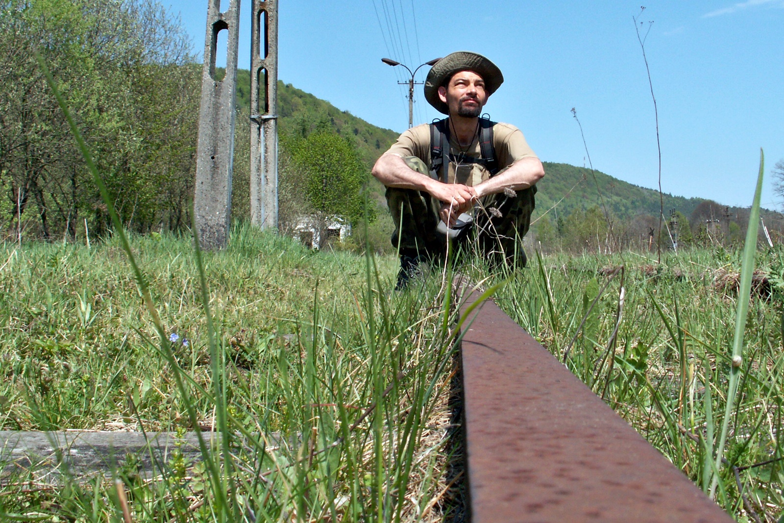 trudem odnajdując wśród traw fragmenty zardzewiałego toru